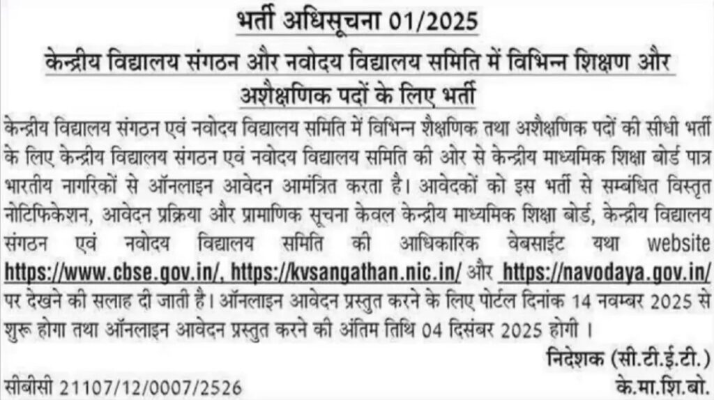 KVS, NVS Recruitment 2025: CBSE ने टीचिंग और नॉन-टीचिंग पदों के लिए शॉर्ट नोटिस जारी किया; 14 नवंबर से आवेदन